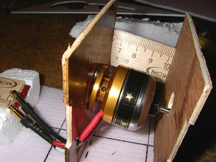 Мотораму изготовил из двух фанерных пластин толщиной 3мм и двух отрезков линейки. Так же для прочности и регулировки наклона пластин внизу у основания добавил два уголка. В шпангоуте "Б" или в задней стенке моторамы не забываем прорезать отверстия для вывода проводов мотора к регулятору. Склейка всей конструкции производилась эпоксидной смолой. Изначально хотел сделать "кривую" раму, что бы потом не заморачиваться с выкосами вниз и вправо. Но на форуме сайта www.modelsworld.ru меня вовремя отговорили и посоветовали сделать наклоны мотора путем подкладывания шайб под основание. Забегая вперед, скажу, что конструкция получилась очень прочная - после нескольких сильных лобовых ударов о землю лопнула передняя стенка в месте крепления двигателя. Второй вариант, когда сама рама покупная, а основание из пенопласта я рассматривать здесь не буду, так как этот вариант еще не прошел летные испытания. Да и сложного там ничего нет: изготавливается пенопластовое основание, усиленное линейками под уже готовую мотораму.